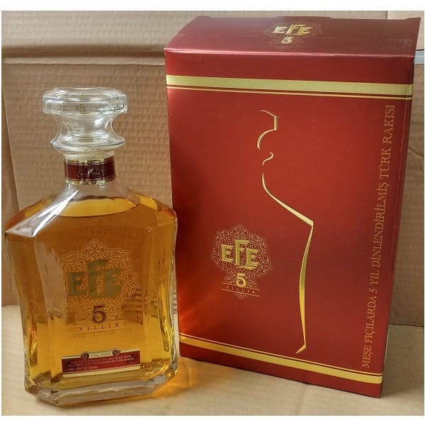 Der ‚Efe Rakı 5 Jahre‚ wurde durch die Destillation von 100% Trauben (ohne Zusatz von Agraralkohol) in Kupferbrennkesseln gewonnen. Wie der Name es verrät, wird der ‚Efe Raki (5 years old) in Eichenfässern gereift, wodurch er seine gelbliche Farbe bekommt. Durch die Holzreife werden die Anisaromen zurückhaltender und treten eingebunden mit den holzigen Noten der Eiche auf. Sehr gut gekühlt, ggf. mit Eis und vor dem Essen als Aperitif oder nach dem Essen als Digestif getrunken werden. Der ‚Efe Raki 5 yıllık‘ mit seiner Flasche ist mehr als ein Raki. Er ist in diesem Sinne eine Innovation / eine Revolution in der Rakigeschichte der Türkei. Jährlich werden maximal 6000 Flaschen produziert. Die ideale Serviertemperatur ist 8-10 °C. Der Alkoholgehalt beträgt 45 % Vol.