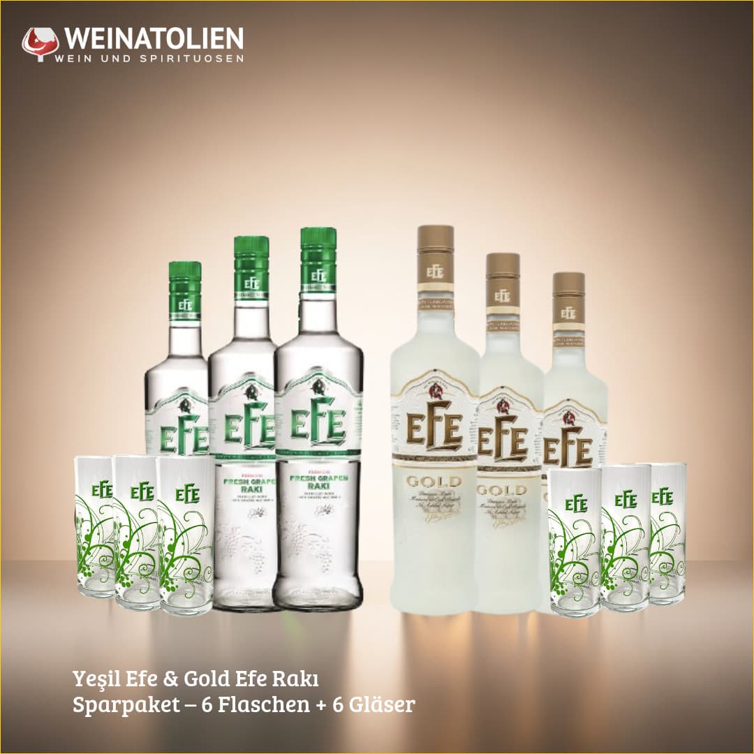 Mit dem Yeşil Efe & Gold Efe Rakı Sparpaket entdecken Sie zwei unterschiedliche Interpretationen der traditionellen türkischen Rakı-Kultur.